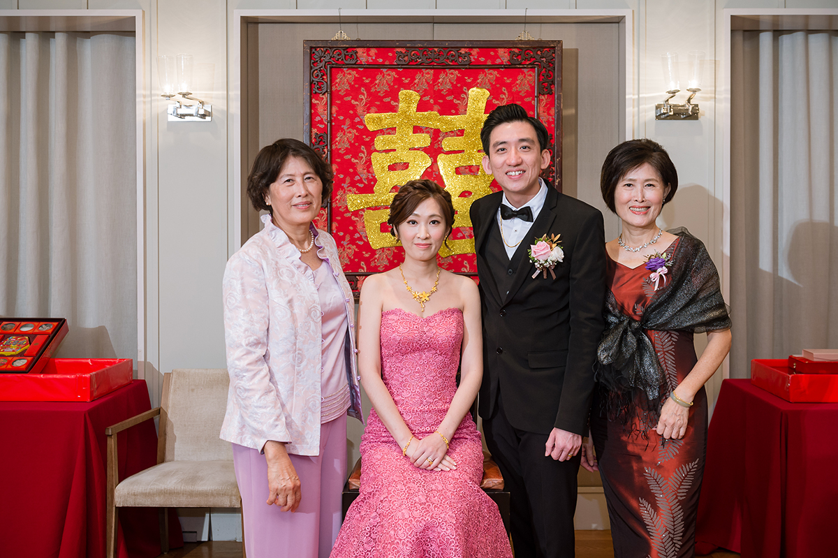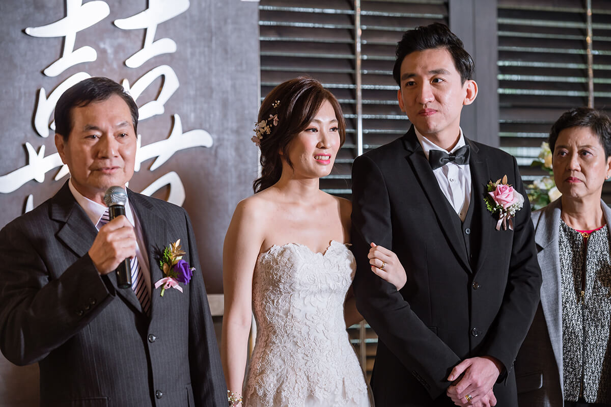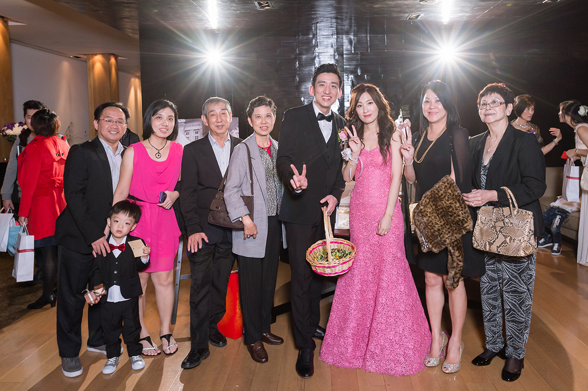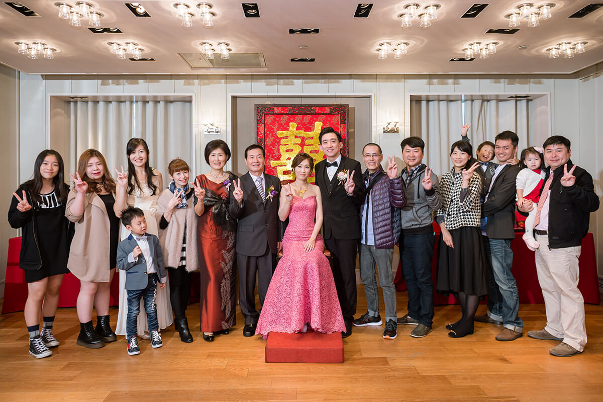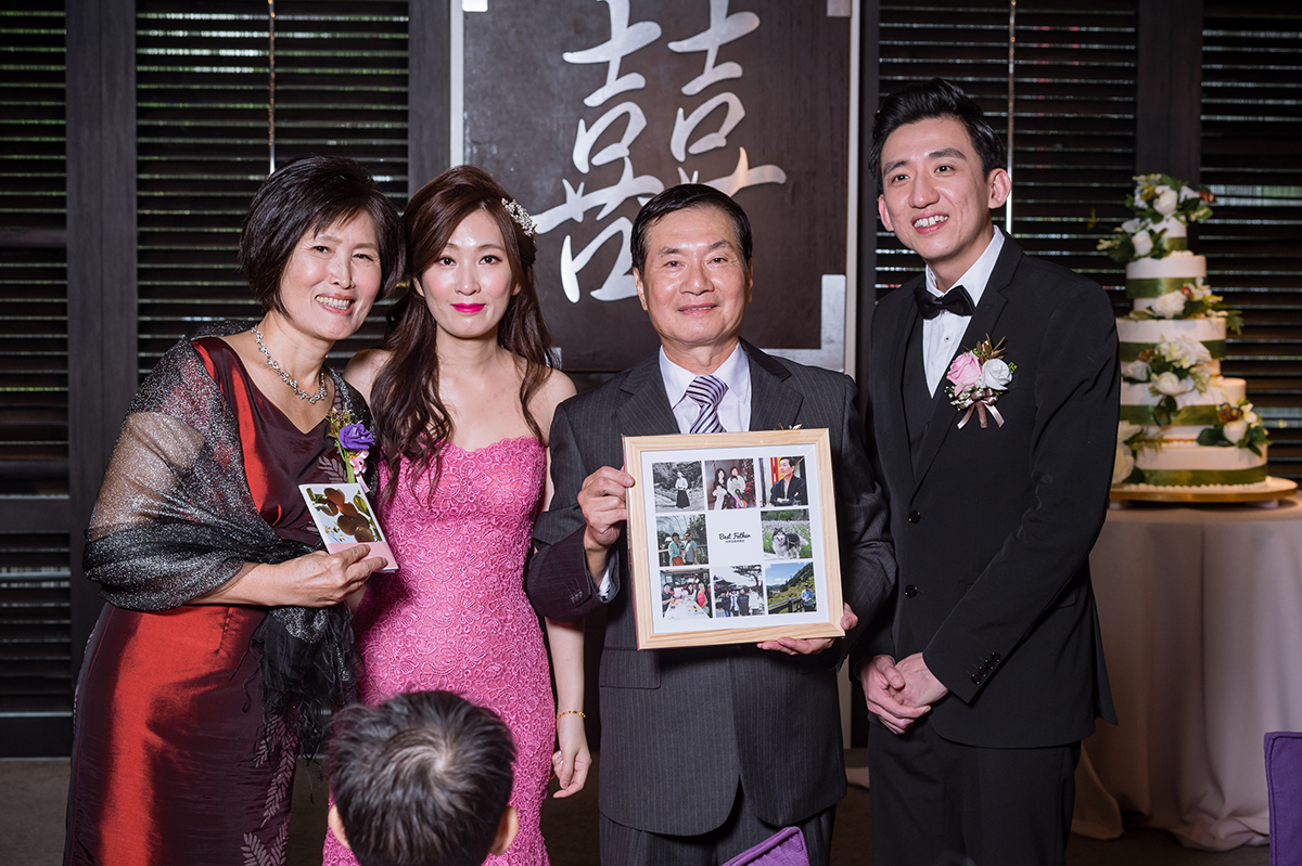 敬酒之後新人安排了給父母親的驚喜,新娘在婚禮上送上給父母的禮物,把家人的照片做成一幅相框,對於即將遠行的新娘一家來說,很有意義。婚宴結束後,新人與長輩奉茶,並留下全家福的紀念,拍過這麼多場婚禮的我發現,越是經常分隔兩地的家人越珍惜彼此相處的時光,因為家人是最重要的。