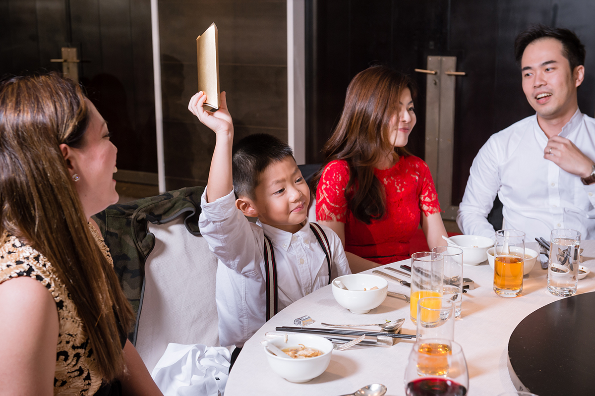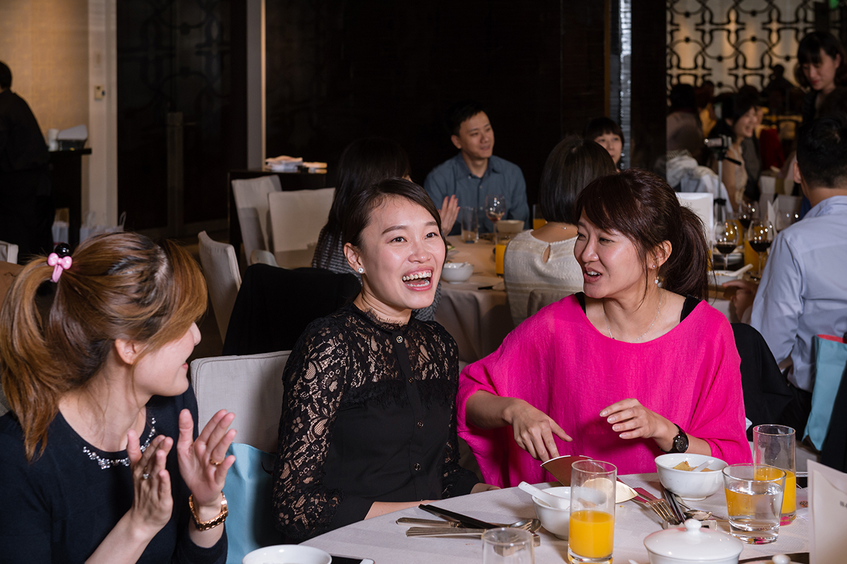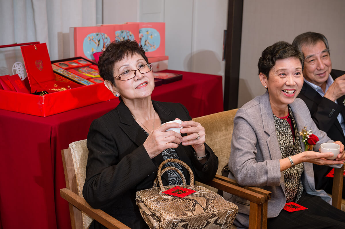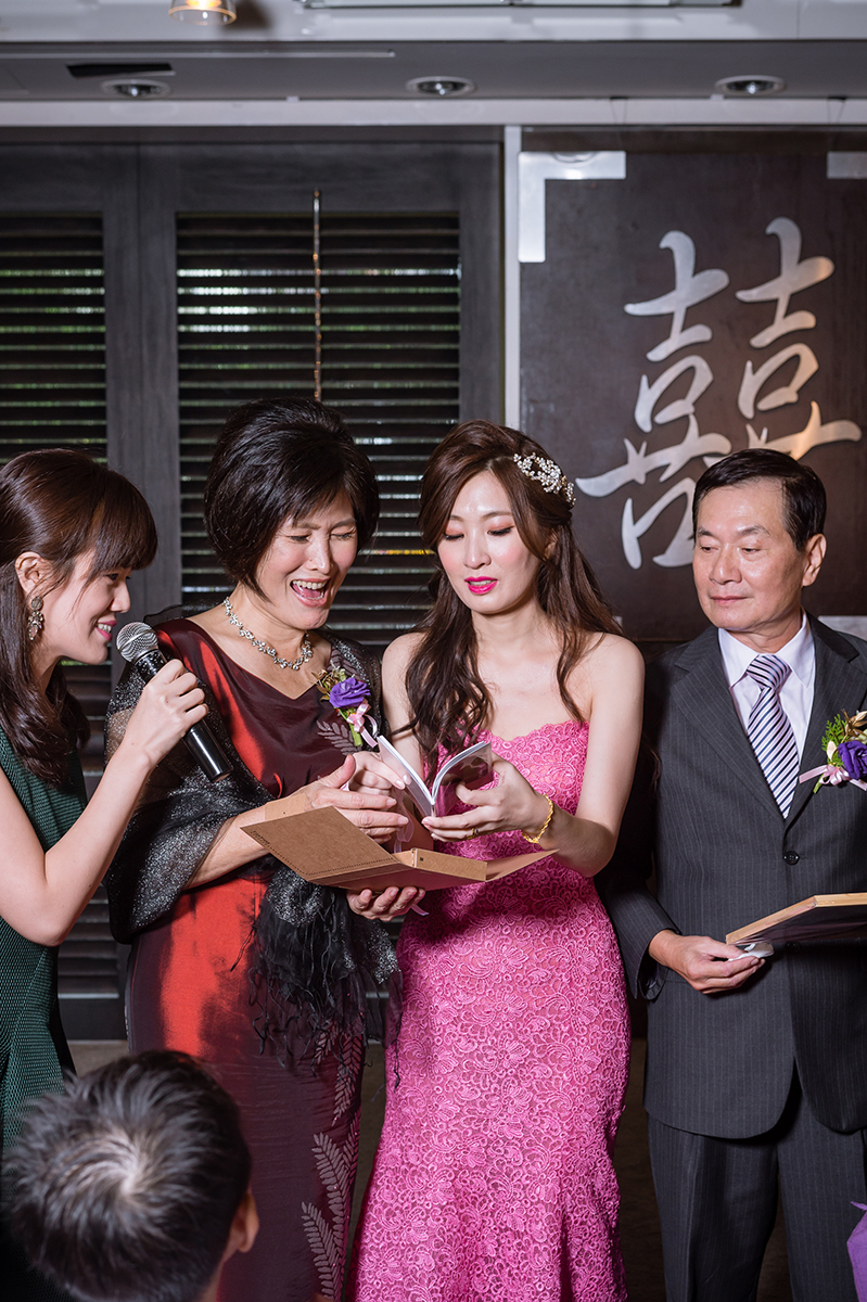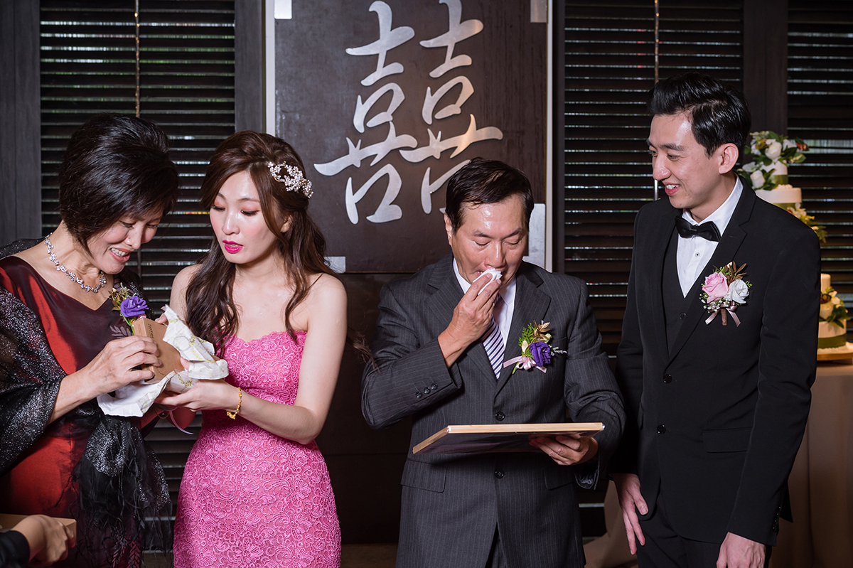 敬酒之後新人安排了給父母親的驚喜,新娘在婚禮上送上給父母的禮物,把家人的照片做成一幅相框,對於即將遠行的新娘一家來說,很有意義。婚宴結束後,新人與長輩奉茶,並留下全家福的紀念,拍過這麼多場婚禮的我發現,越是經常分隔兩地的家人越珍惜彼此相處的時光,因為家人是最重要的。