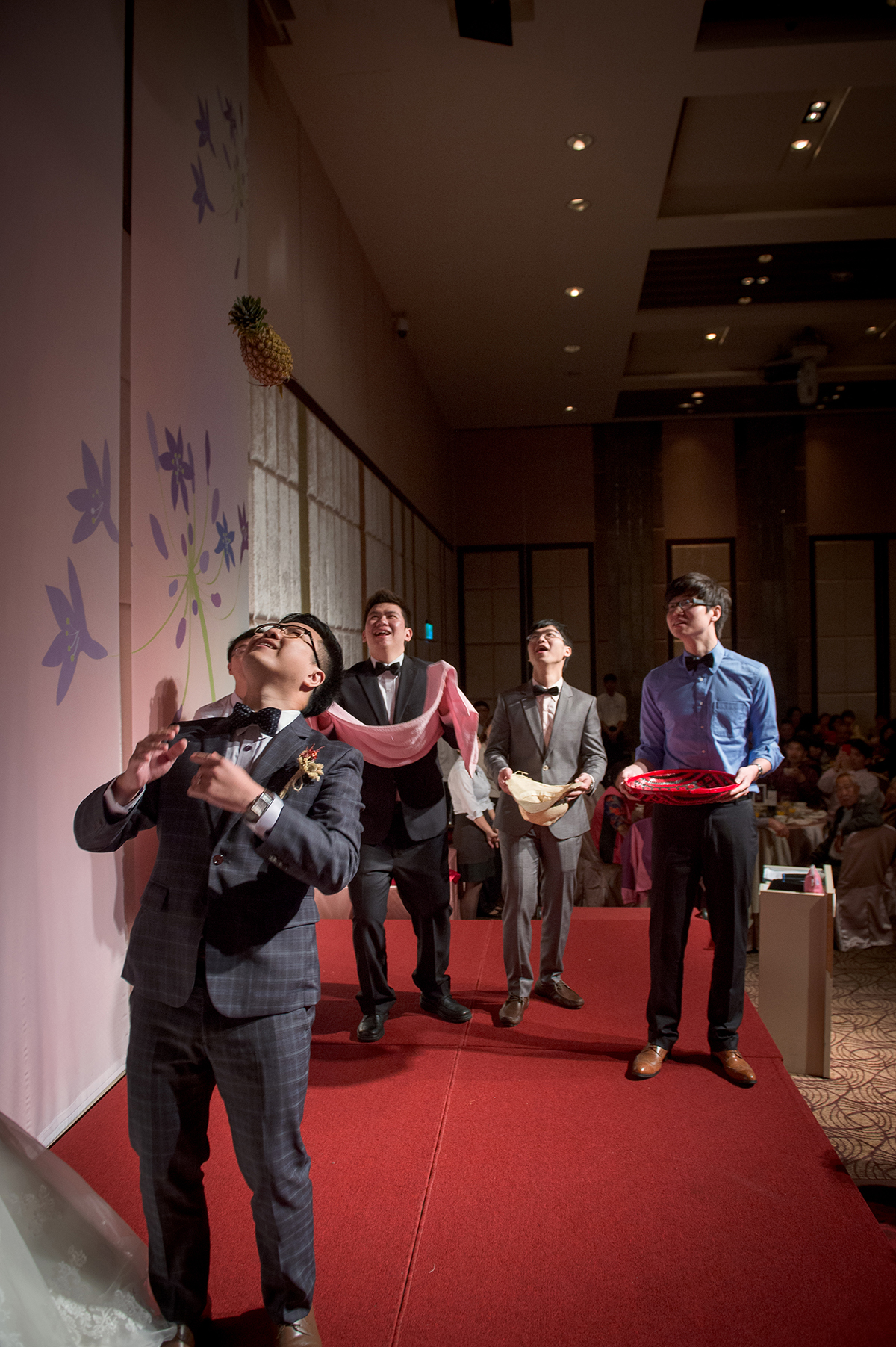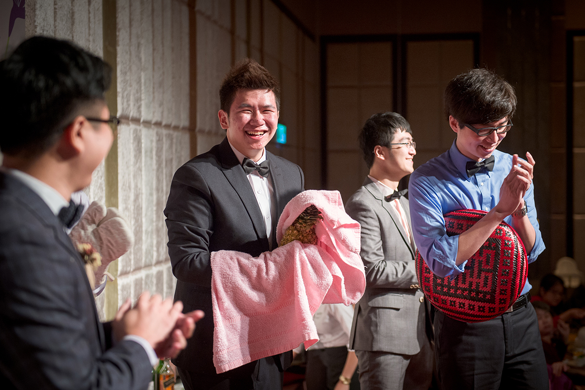 由於上午的儀式中已經送過捧花,宴會時就只有新郎丟鳳梨送給好友們,