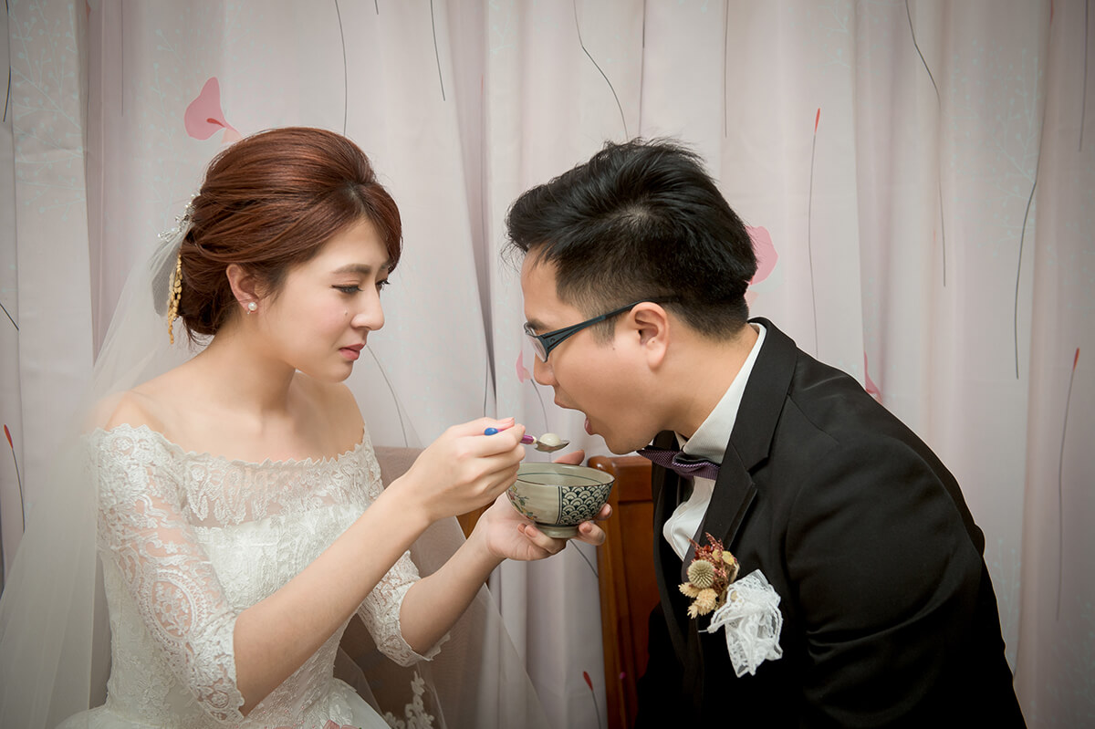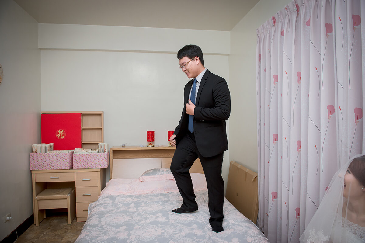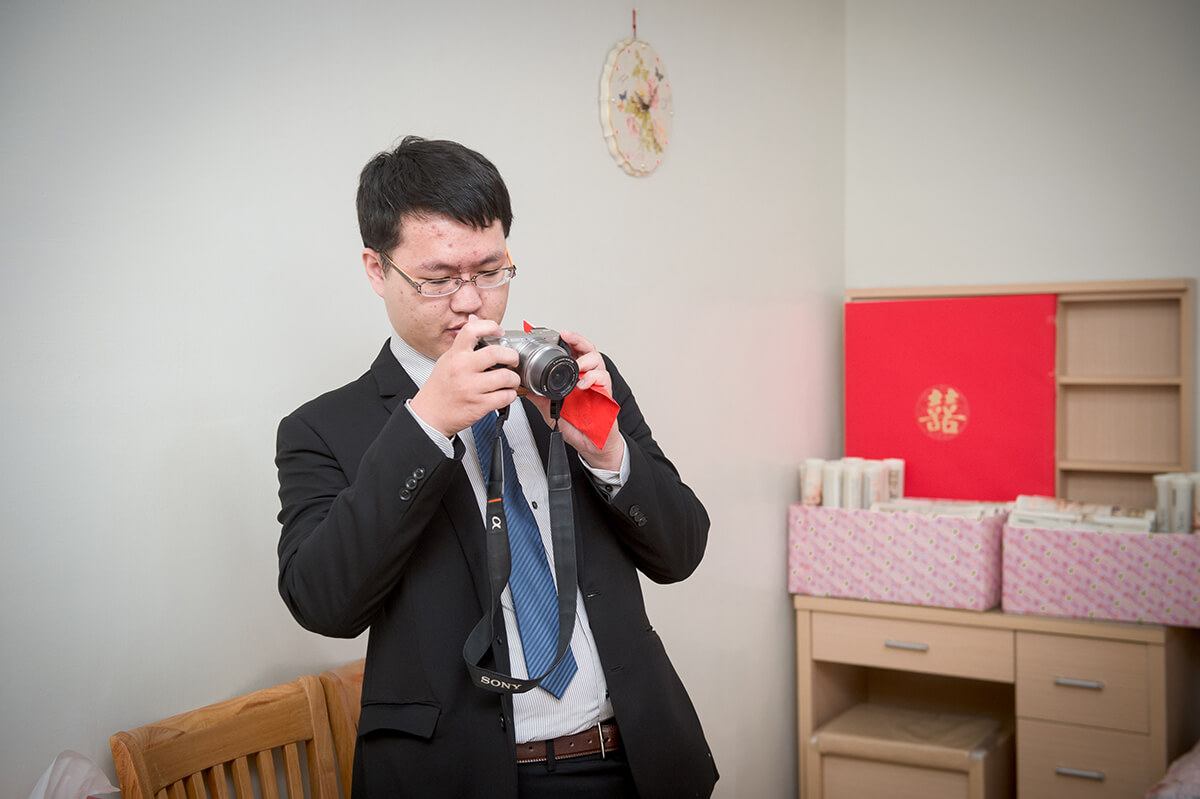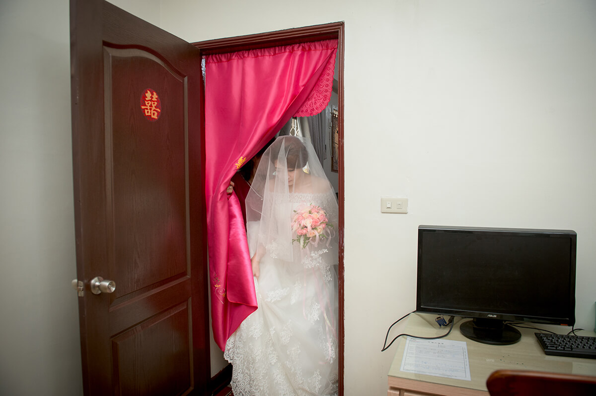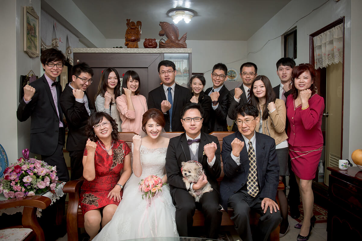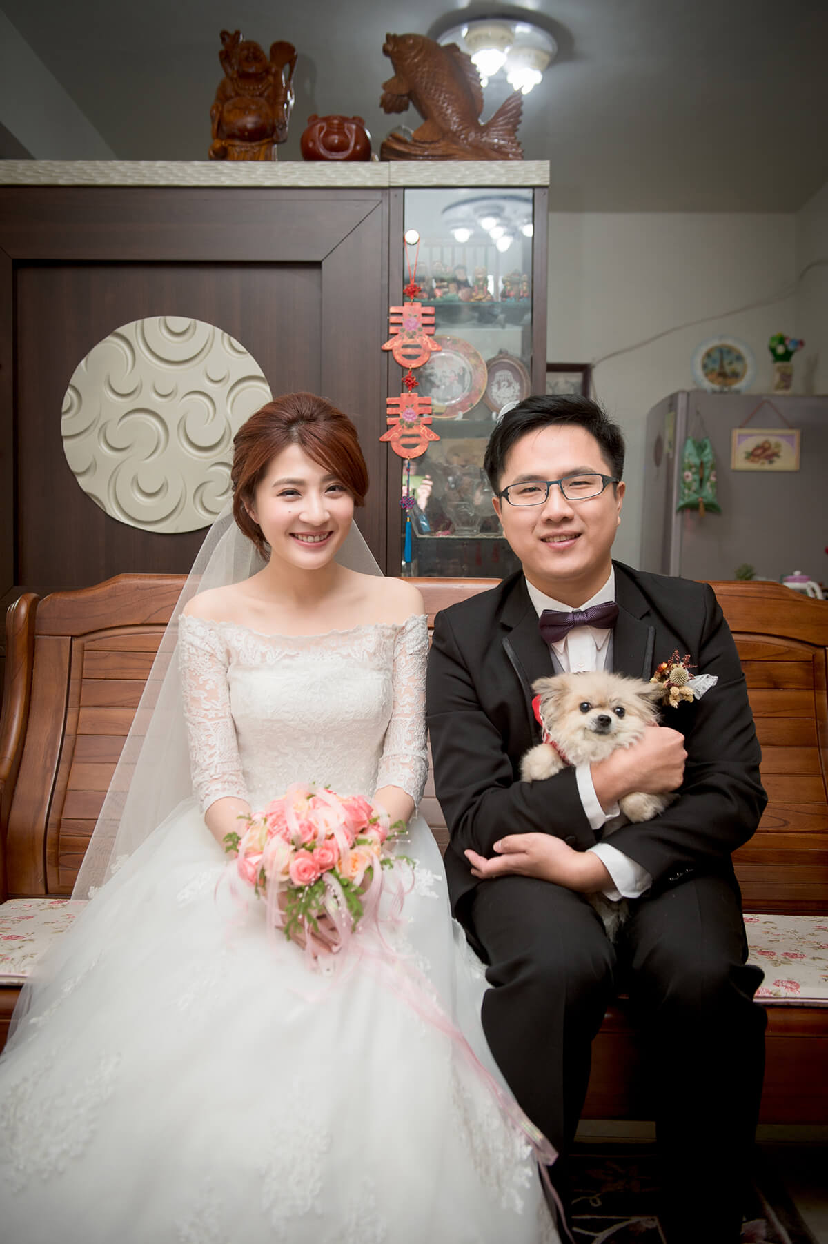 阿思是我2013年新人的伴娘,一開始聯絡的時候,就用迅速的時間下訂,每每接到之前客人介紹來的客人,我們都會更謹慎處理。 這場婚禮的儀式與宴客是分兩天舉行,由於地點在台中,時間又有點早,前一晚我們就入住通豪大飯店,這間飯店在我小的時候常來用餐,隔了這麼多年似乎變了不少。由於新娘阿思是位難得的氣質美女,迎娶的過程姊妹們當然要出些題目給新郎,經歷重重難關看到新娘阿思,真的是覺得賺到了!拜別的時候,看到阿思的淚水,讓人覺得很心疼,但從兩人的互動中可以感覺到阿寬真的很疼阿思。 迎娶到男方家後,他們家的小狗也一起加入合照,在現代生活裡,養寵物真的可以讓家庭更溫暖和諧,看到他們開心地合照,攝影師我都不自覺地笑了…