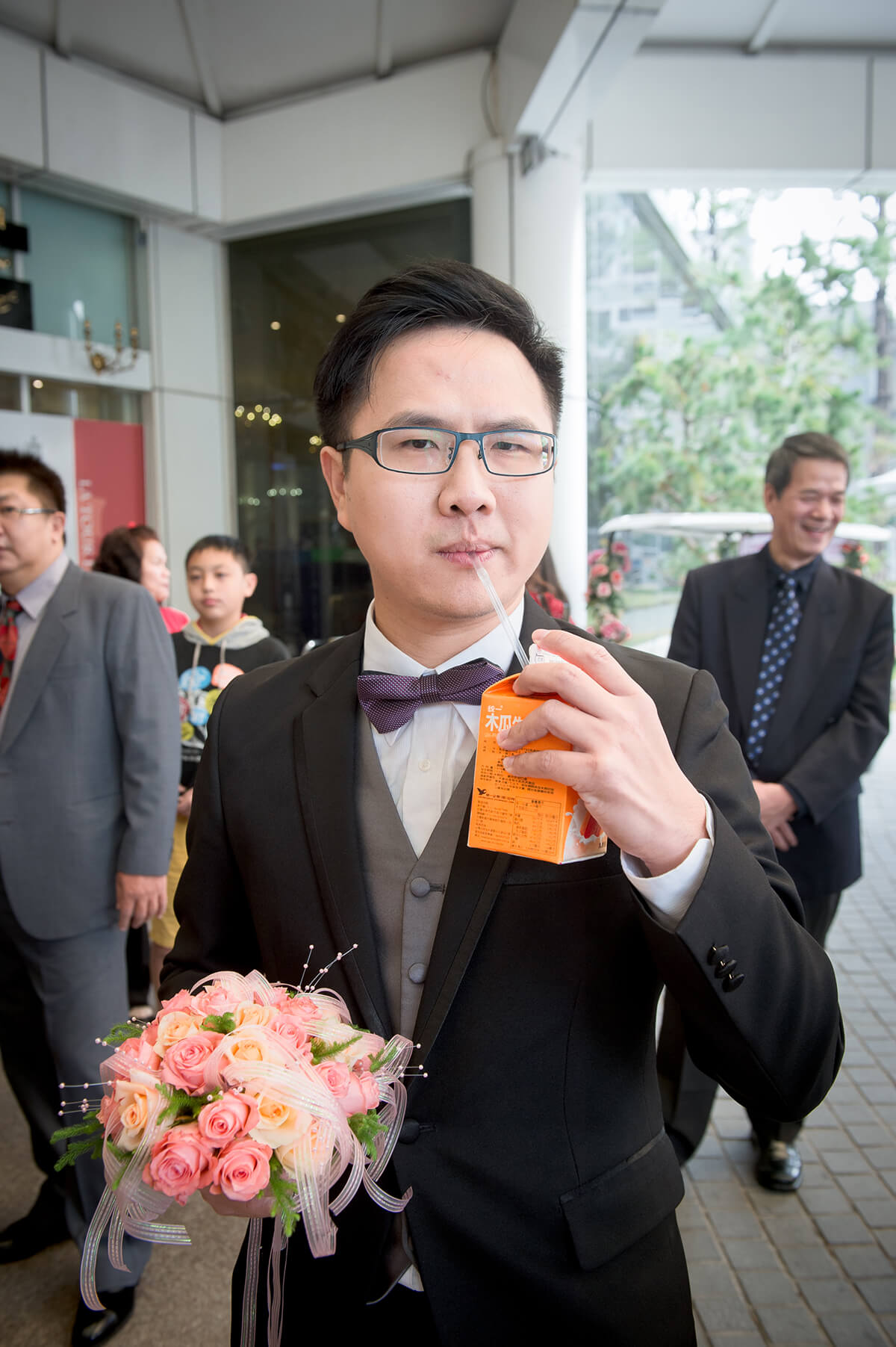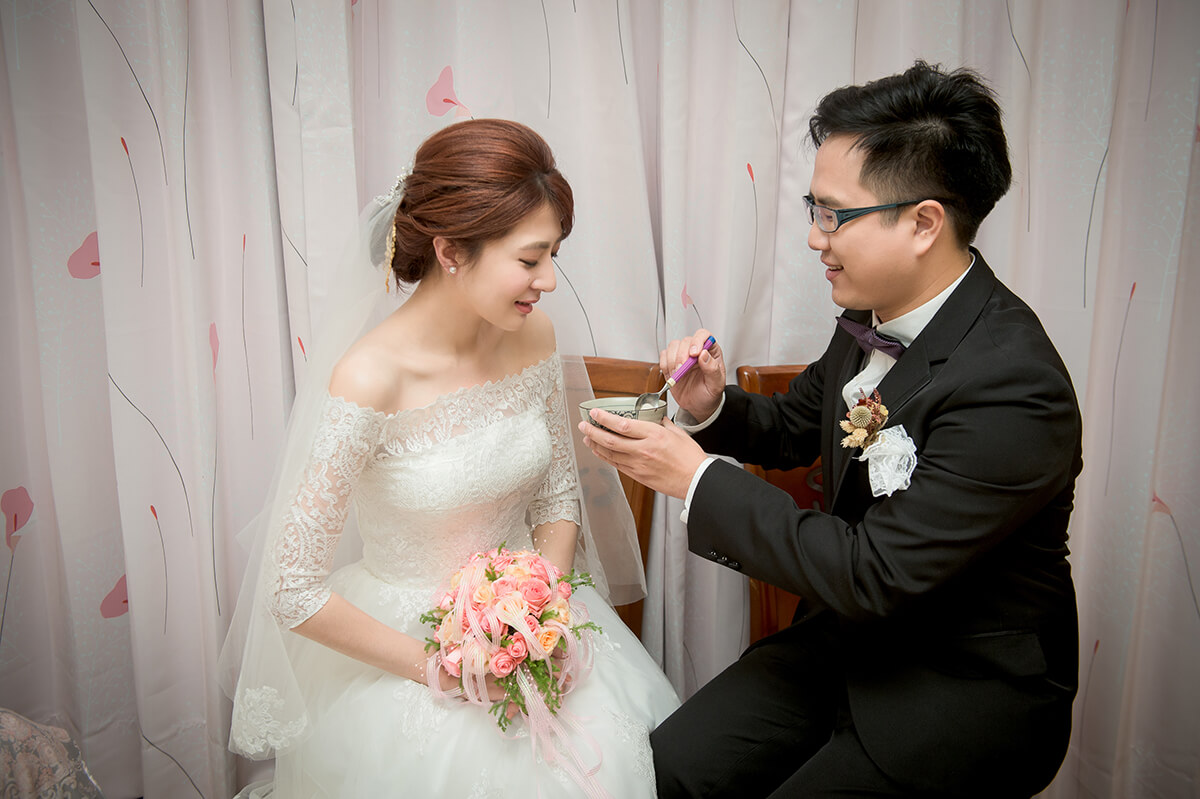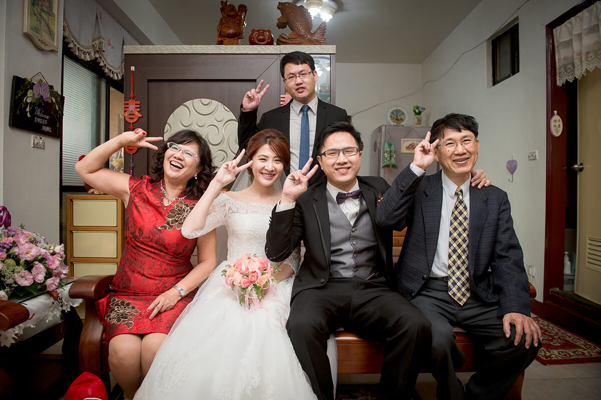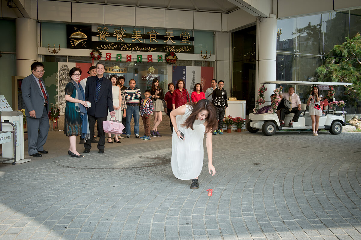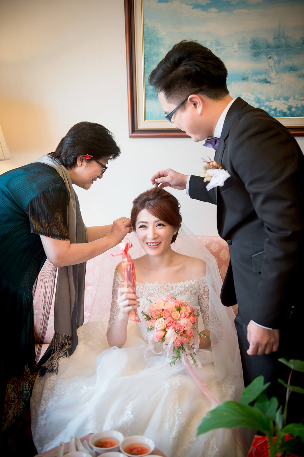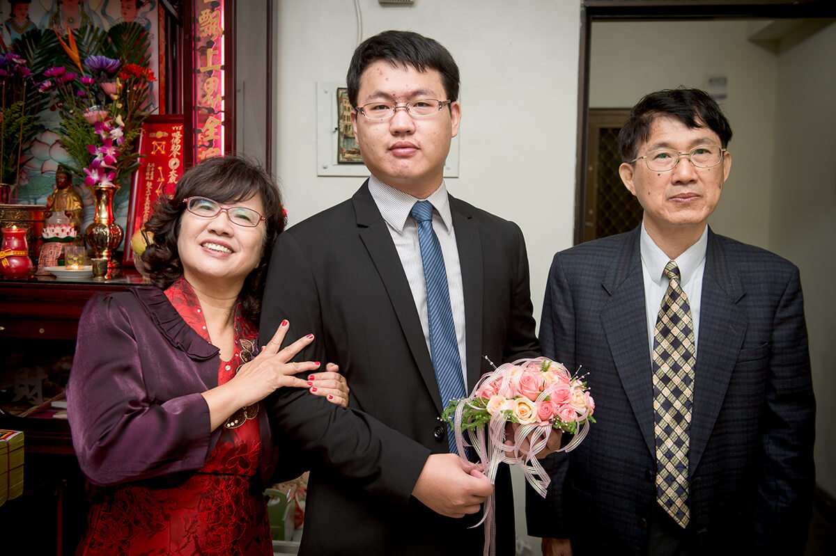 阿思是我2013年新人的伴娘,一開始聯絡的時候,就用迅速的時間下訂,每每接到之前客人介紹來的客人,我們都會更謹慎處理。 這場婚禮的儀式與宴客是分兩天舉行,由於地點在台中,時間又有點早,前一晚我們就入住通豪大飯店,這間飯店在我小的時候常來用餐,隔了這麼多年似乎變了不少。由於新娘阿思是位難得的氣質美女,迎娶的過程姊妹們當然要出些題目給新郎,經歷重重難關看到新娘阿思,真的是覺得賺到了!拜別的時候,看到阿思的淚水,讓人覺得很心疼,但從兩人的互動中可以感覺到阿寬真的很疼阿思。 迎娶到男方家後,他們家的小狗也一起加入合照,在現代生活裡,養寵物真的可以讓家庭更溫暖和諧,看到他們開心地合照,攝影師我都不自覺地笑了…
