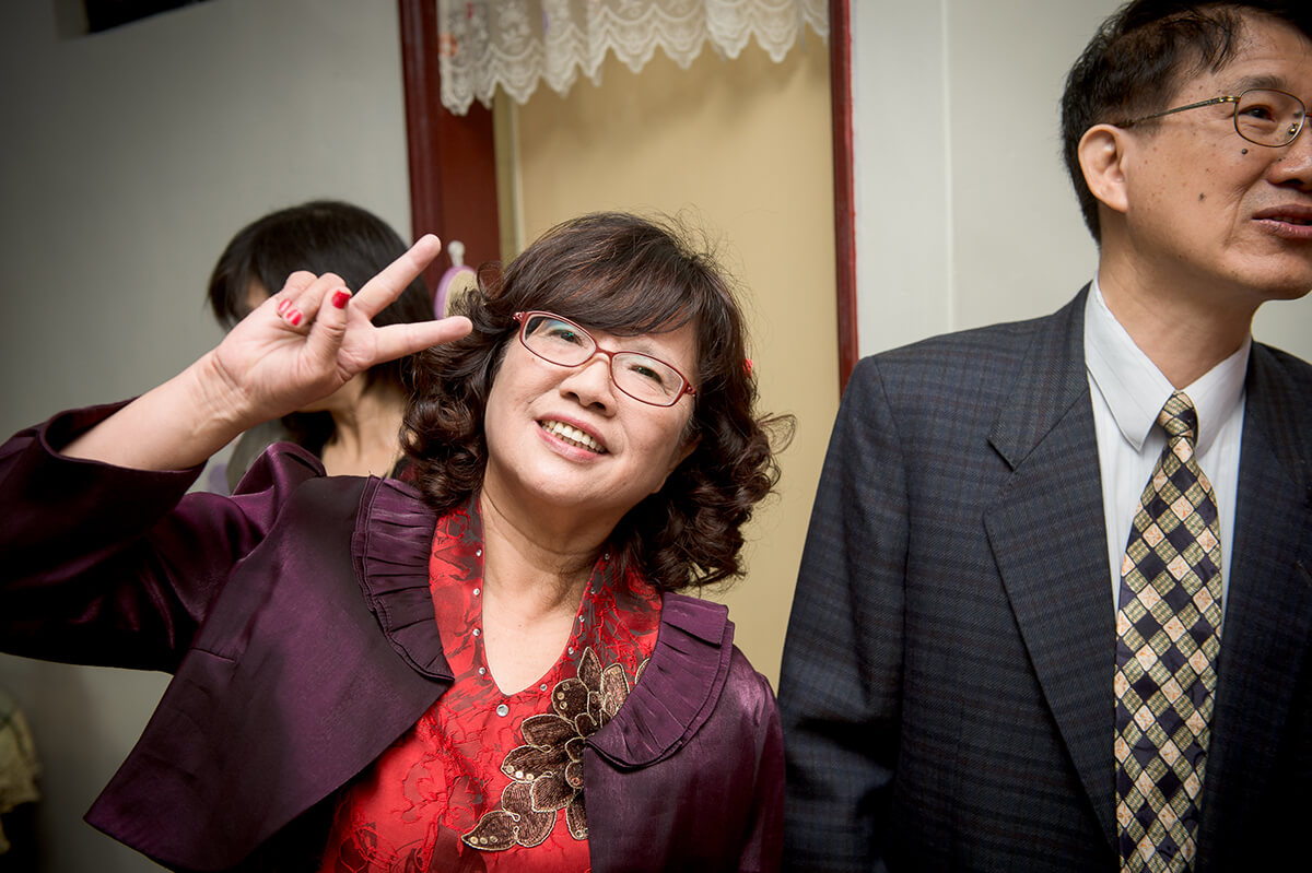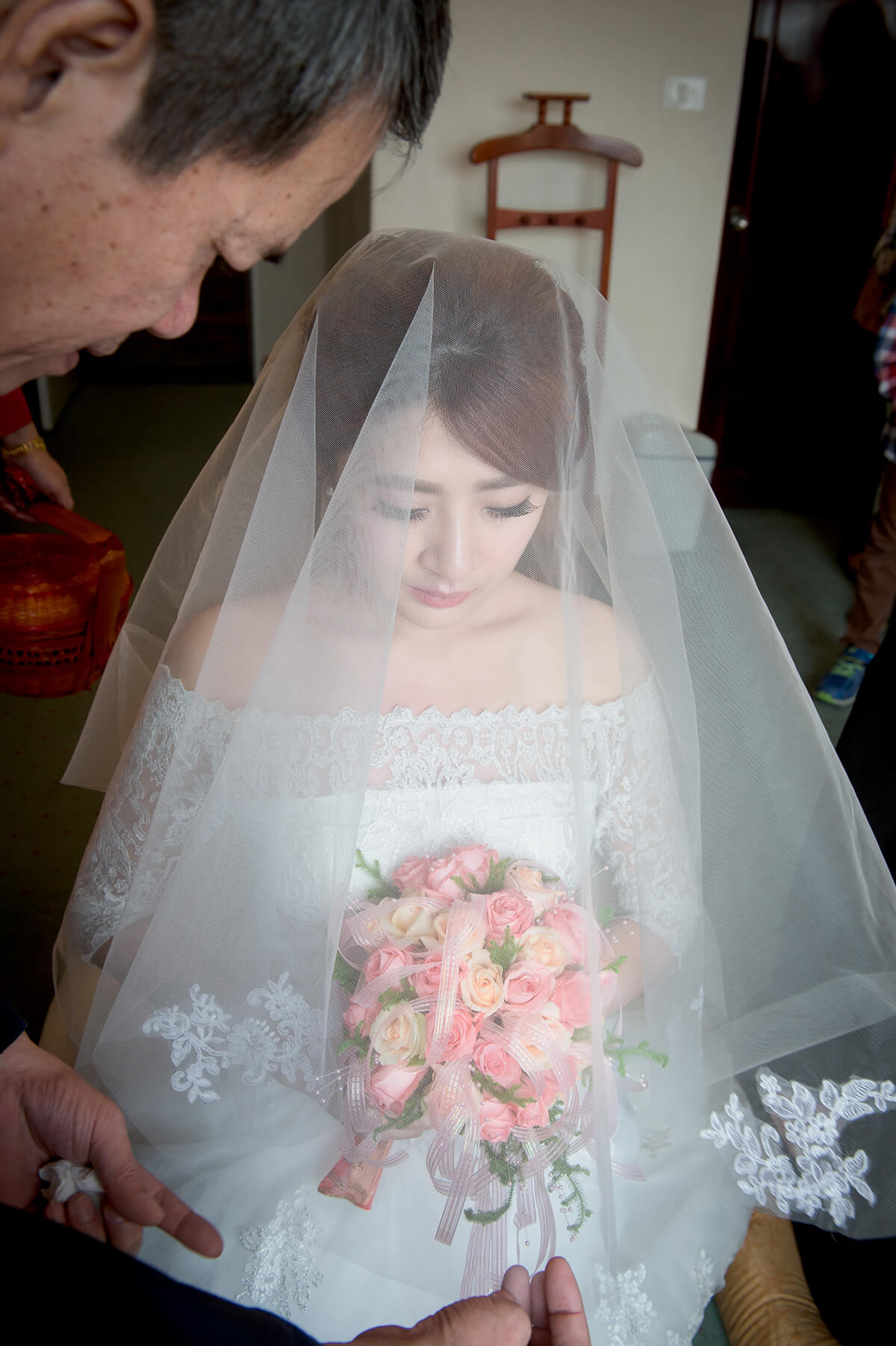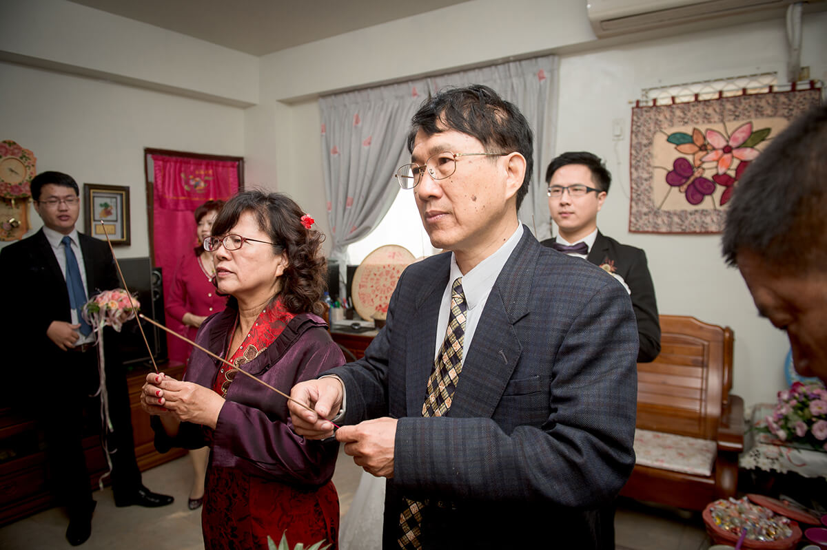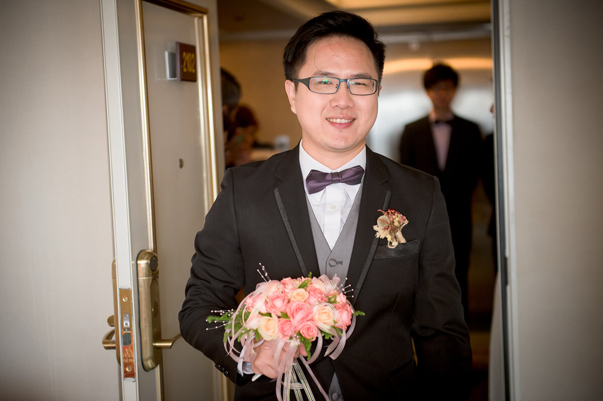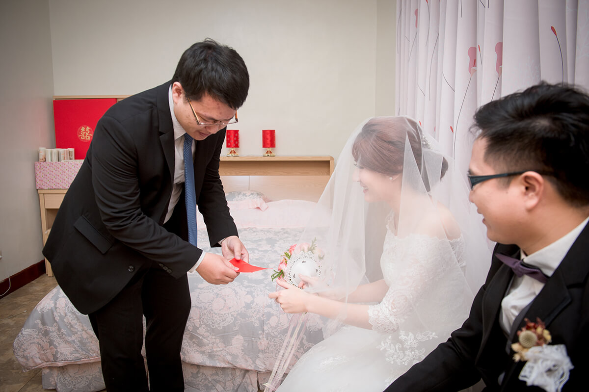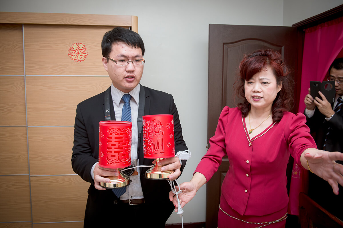 阿思是我2013年新人的伴娘,一開始聯絡的時候,就用迅速的時間下訂,每每接到之前客人介紹來的客人,我們都會更謹慎處理。 這場婚禮的儀式與宴客是分兩天舉行,由於地點在台中,時間又有點早,前一晚我們就入住通豪大飯店,這間飯店在我小的時候常來用餐,隔了這麼多年似乎變了不少。由於新娘阿思是位難得的氣質美女,迎娶的過程姊妹們當然要出些題目給新郎,經歷重重難關看到新娘阿思,真的是覺得賺到了!拜別的時候,看到阿思的淚水,讓人覺得很心疼,但從兩人的互動中可以感覺到阿寬真的很疼阿思。 迎娶到男方家後,他們家的小狗也一起加入合照,在現代生活裡,養寵物真的可以讓家庭更溫暖和諧,看到他們開心地合照,攝影師我都不自覺地笑了…