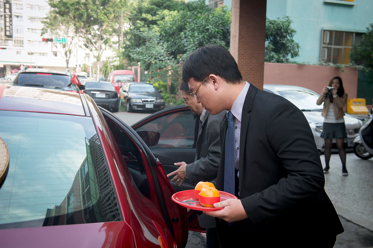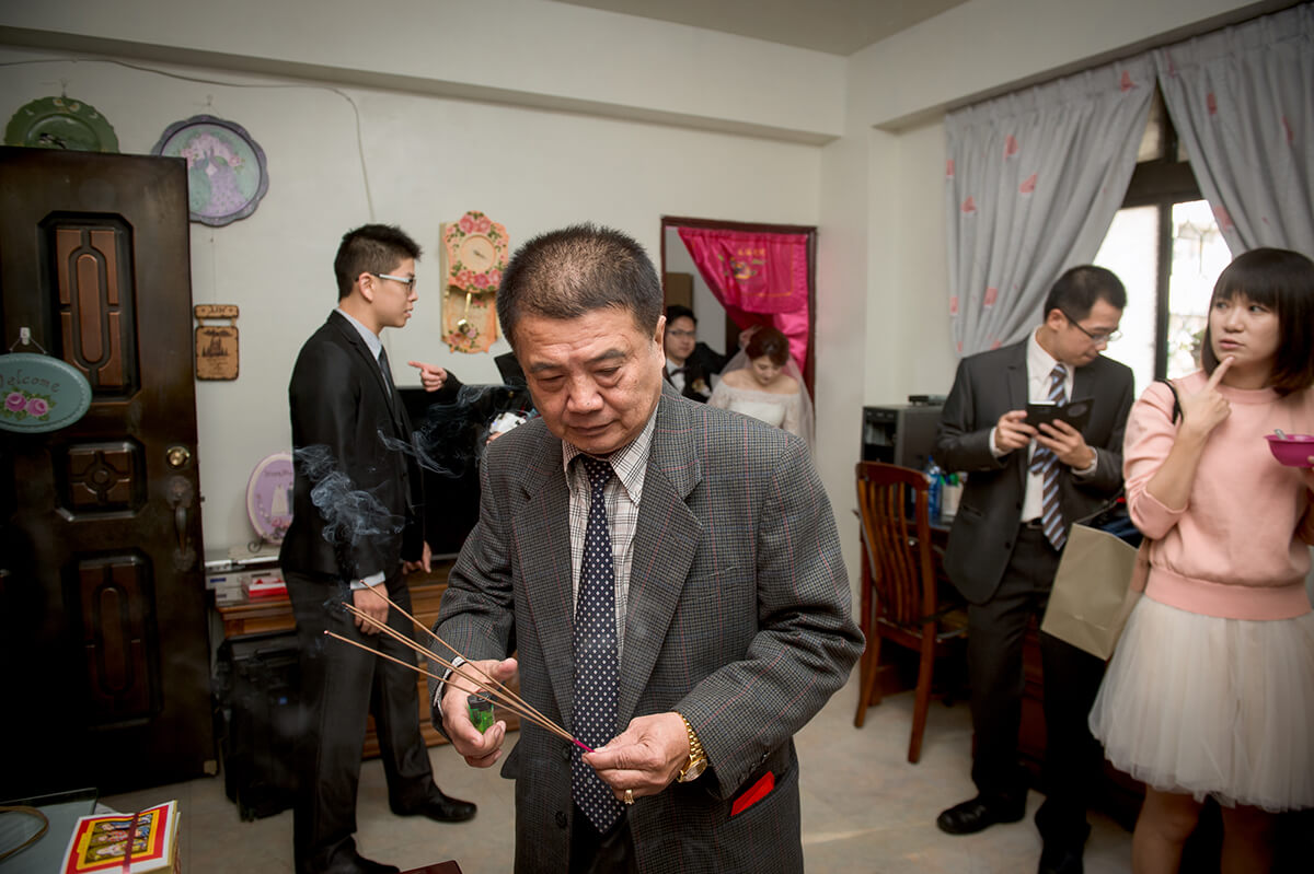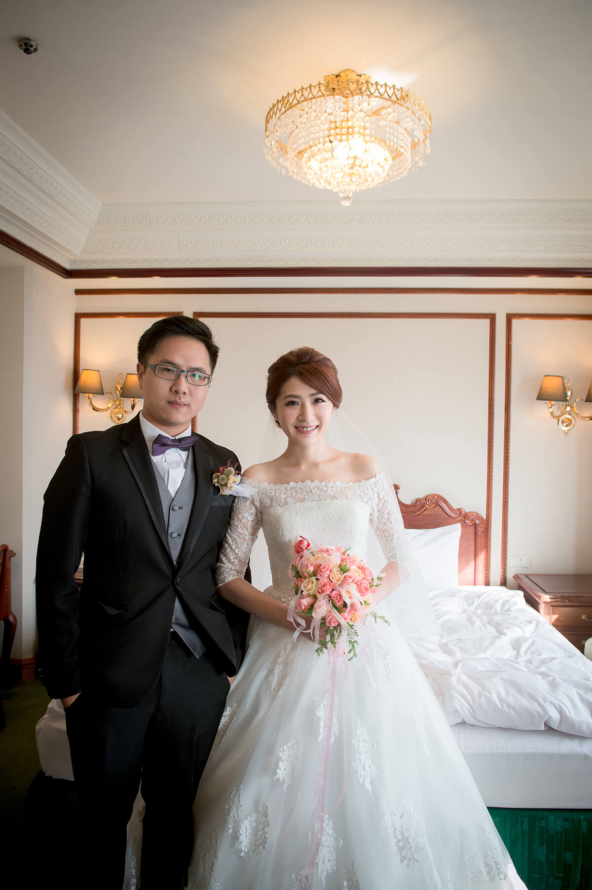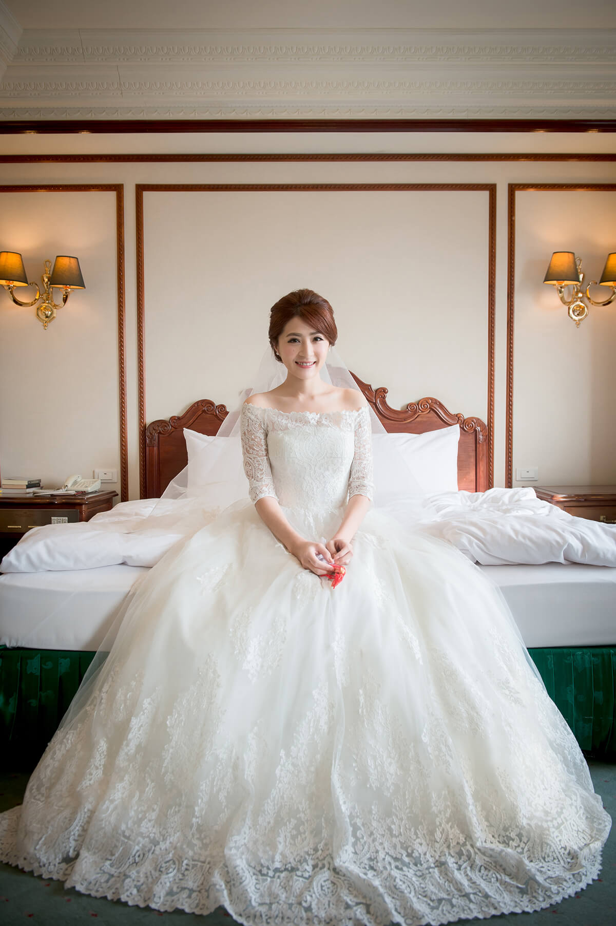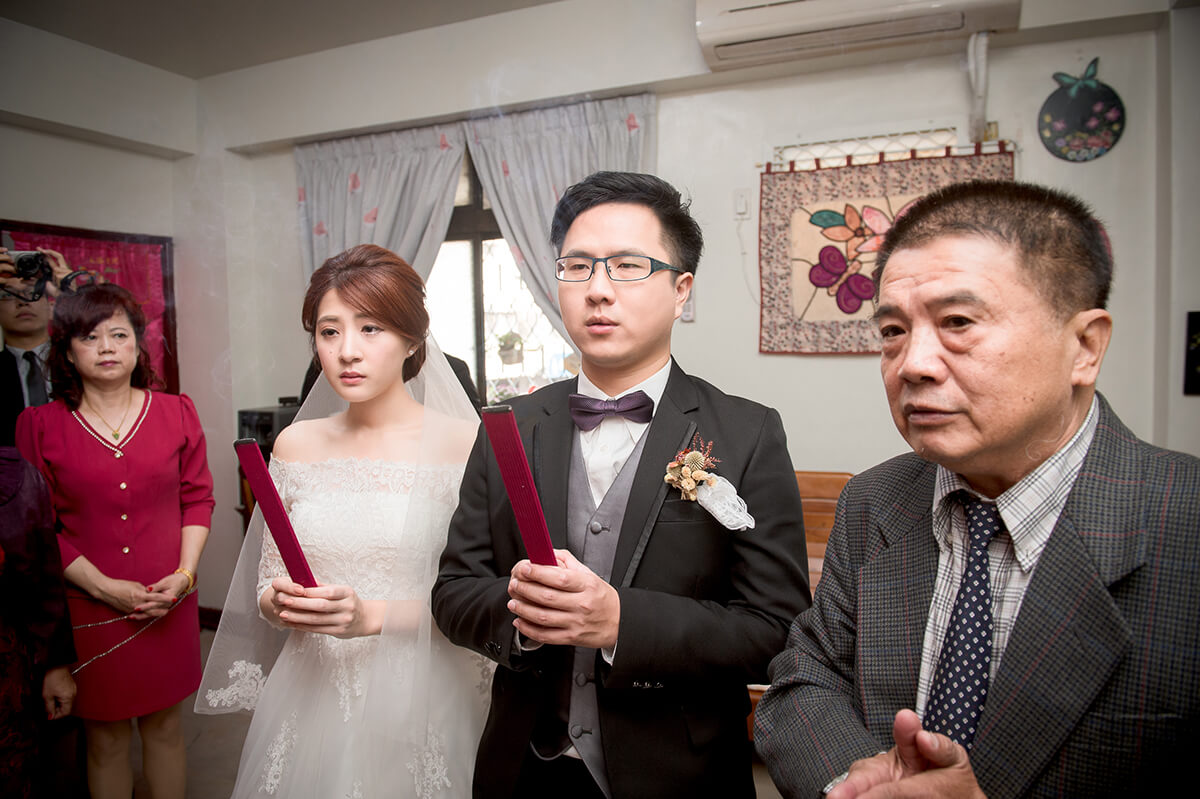 阿思是我2013年新人的伴娘,一開始聯絡的時候,就用迅速的時間下訂,每每接到之前客人介紹來的客人,我們都會更謹慎處理。 這場婚禮的儀式與宴客是分兩天舉行,由於地點在台中,時間又有點早,前一晚我們就入住通豪大飯店,這間飯店在我小的時候常來用餐,隔了這麼多年似乎變了不少。由於新娘阿思是位難得的氣質美女,迎娶的過程姊妹們當然要出些題目給新郎,經歷重重難關看到新娘阿思,真的是覺得賺到了!拜別的時候,看到阿思的淚水,讓人覺得很心疼,但從兩人的互動中可以感覺到阿寬真的很疼阿思。 迎娶到男方家後,他們家的小狗也一起加入合照,在現代生活裡,養寵物真的可以讓家庭更溫暖和諧,看到他們開心地合照,攝影師我都不自覺地笑了…