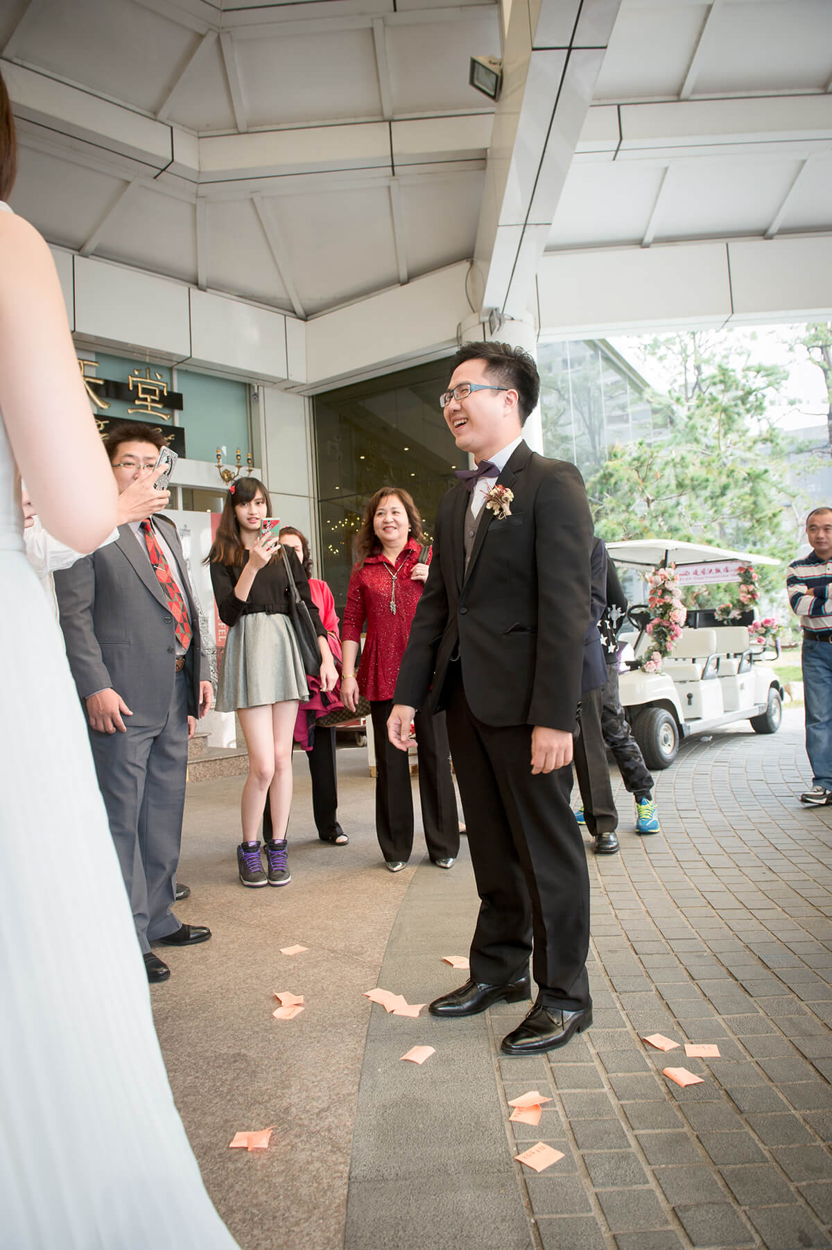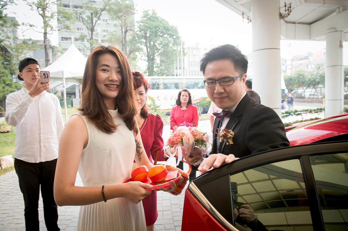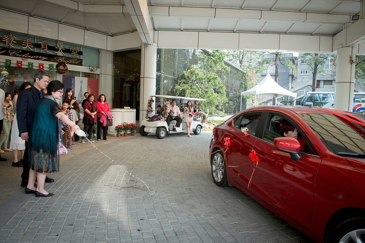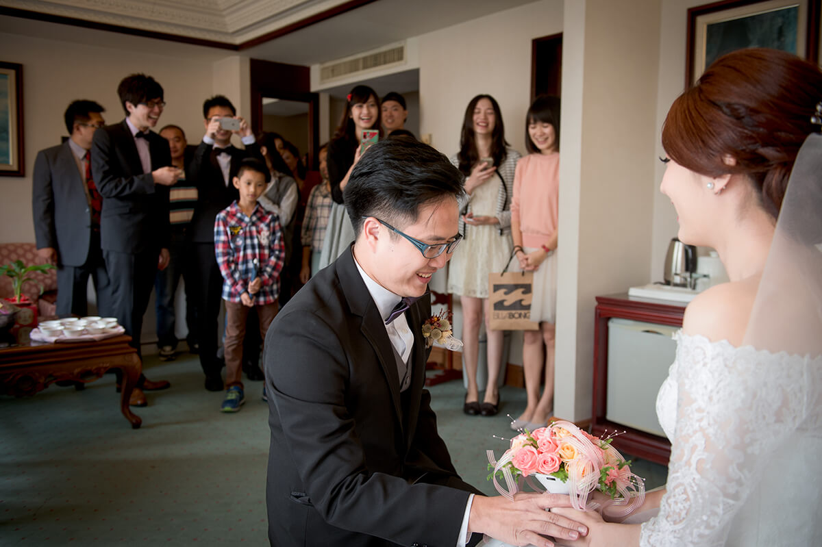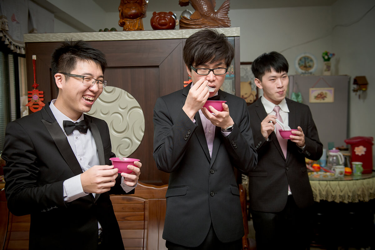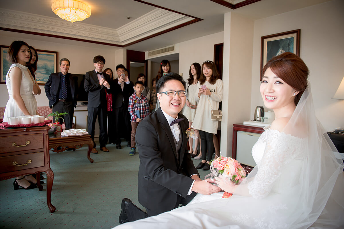 阿思是我2013年新人的伴娘,一開始聯絡的時候,就用迅速的時間下訂,每每接到之前客人介紹來的客人,我們都會更謹慎處理。 這場婚禮的儀式與宴客是分兩天舉行,由於地點在台中,時間又有點早,前一晚我們就入住通豪大飯店,這間飯店在我小的時候常來用餐,隔了這麼多年似乎變了不少。由於新娘阿思是位難得的氣質美女,迎娶的過程姊妹們當然要出些題目給新郎,經歷重重難關看到新娘阿思,真的是覺得賺到了!拜別的時候,看到阿思的淚水,讓人覺得很心疼,但從兩人的互動中可以感覺到阿寬真的很疼阿思。 迎娶到男方家後,他們家的小狗也一起加入合照,在現代生活裡,養寵物真的可以讓家庭更溫暖和諧,看到他們開心地合照,攝影師我都不自覺地笑了…