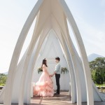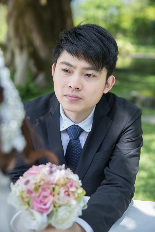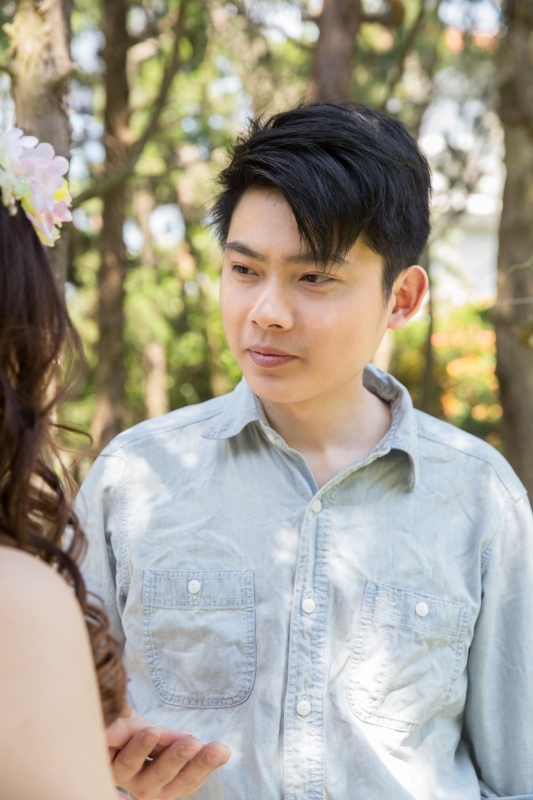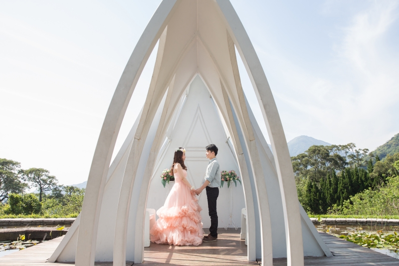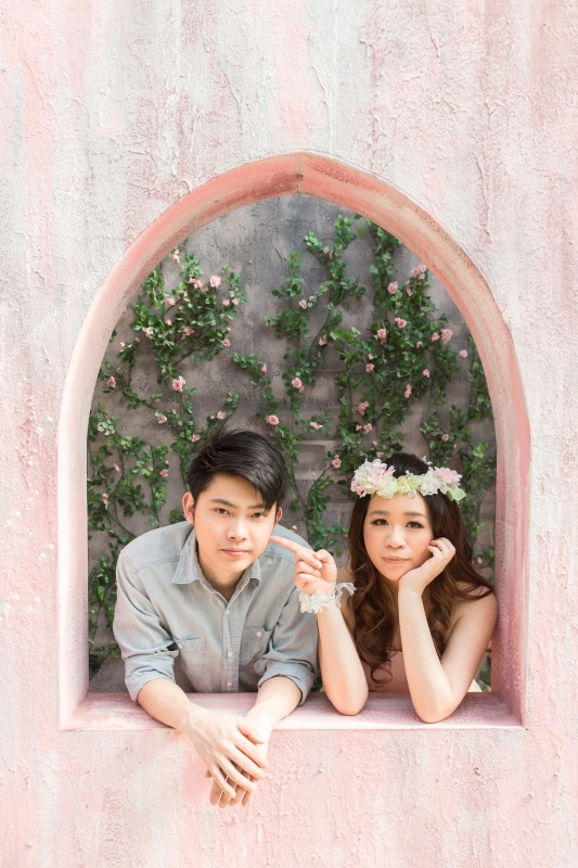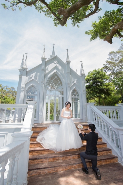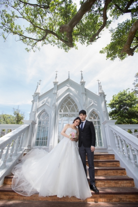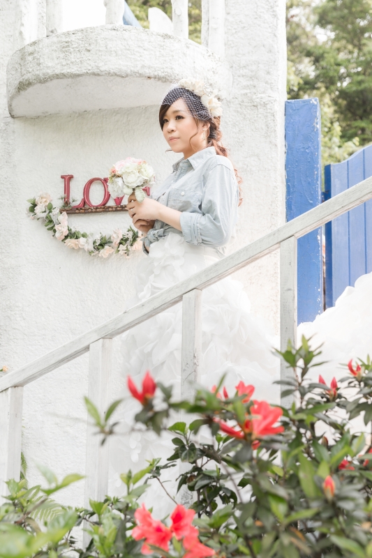 君儀是個害羞可愛的女孩,因為她的關係,讓我第一次來到真愛桃花源,這裏是位在文化大學旁邊,是最近蠻熱門的婚紗景點之一,前一陣子做了一個類似沖繩克莉絲丁教堂的場景,這個景也成為我們當天拍攝的第一個畫面。(由於這個景剛蓋好,拍攝時需要排隊,好在我們一早就開始拍,所以不用排多久就排到了)