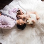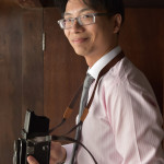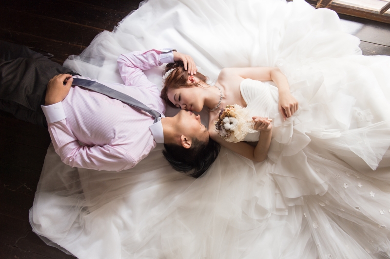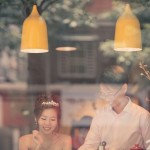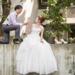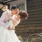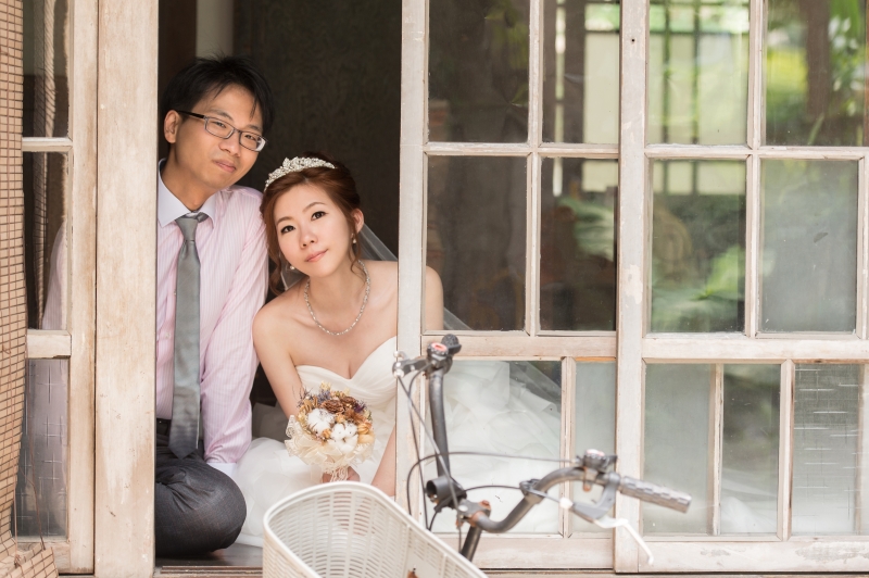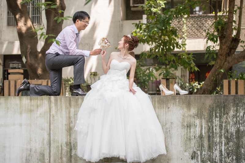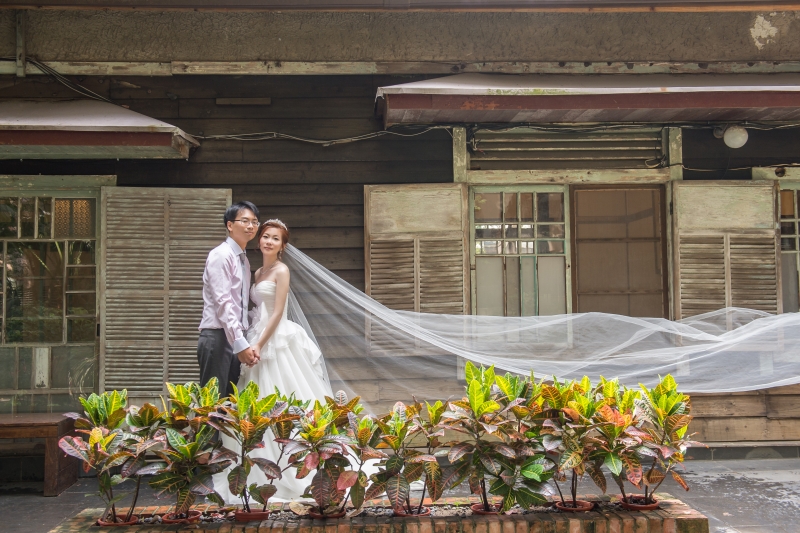 一開始溝通的時候,準新郎告訴我們他個人是偏好比較貼近生活感,呈現比較日常的幸福感,至於準新娘的話,她個人偏好傳統婚紗拍攝風格,夢幻、唯美,所以我們朝這個方向去規劃。由於準新郎覺得「青田七六」的感覺不錯,這裡就成了我們第一個拍攝的景點。道具的部分,由於準新郎自己也喜歡攝影,便帶了Nikon D80與F2,我也把自己的雙眼相機借給他當道具拍攝。