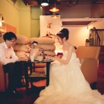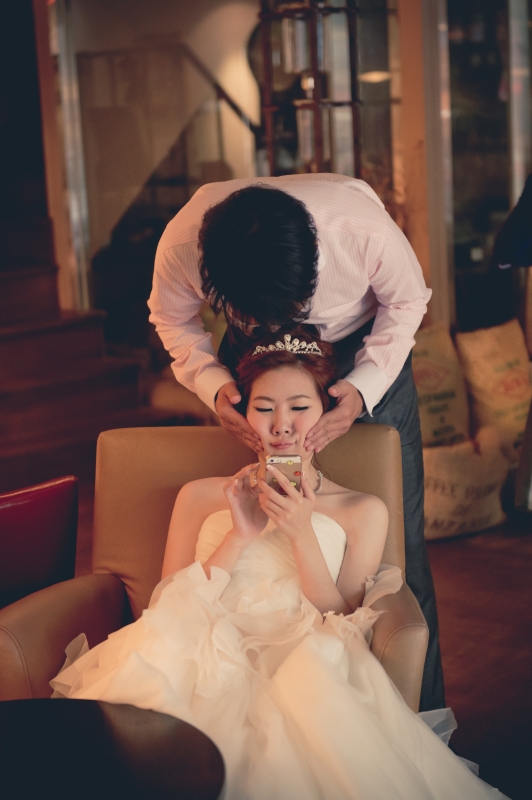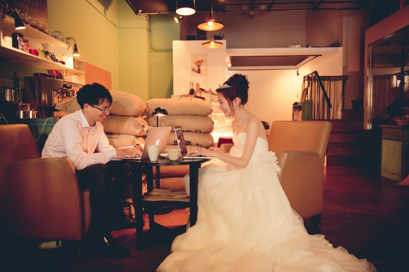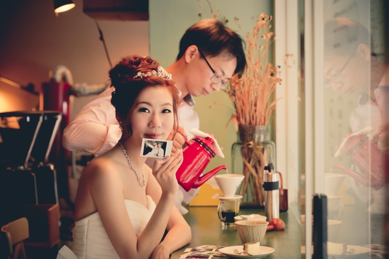 第二個拍攝景點選在咖啡店,準新郎自己準備咖啡手沖組一整組,拍攝他煮咖啡給準新娘品嚐的照片,對他們來說這就是生活。